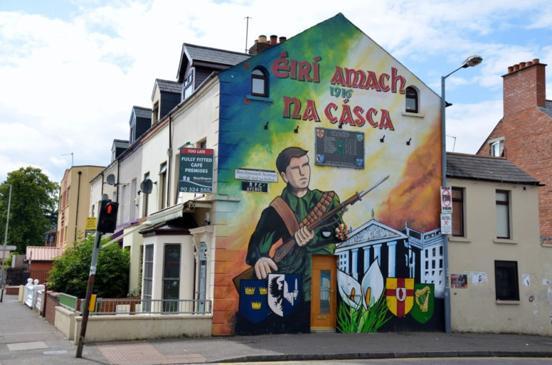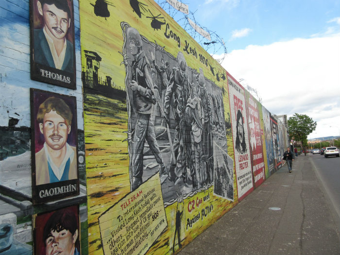 Dopo una mezz’oretta circa dedicata alla visita del Parlamento, risaliamo sul bus per proseguire il nostro giro turistico. Una volta lasciate le luci del centro, ci avventuriamo presto in un’area cupa e degradata: è la famigerata West Belfast teatro dei troubles, i quarantennali terribili scontri che hanno tristemente insanguinato la storia recente di questo paese. A testimonianza di quei tempi bui restano ancora i muri orlati di barriere metalliche, le cancellate a sbarre che dividono le strade, e soprattutto i coloratissimi ed appassionati murales che hanno sempre iconicamente rappresentato i simboli delle motivazioni della guerra civile tra lealisti e repubblicani, ai quali si aggiungono, oggi che la violenza è cessata e si è finalmente riaperto il dibattito politico, le tante pittoresche creazioni grafiche giovanili simili a quelle di altre città del mondo.
