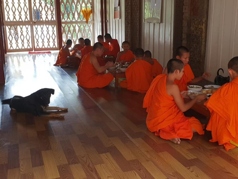 Il primo che visitiamo è il Wat Visoun, il più antico tempio della città; inspirato da quello Khmer, rimane tuttavia unico nel suo stilo con le caratteristiche finestre in legno. Grazie alle conoscenze della nostra guida, riusciamo ad entrare in contatto con alcuni monaci e a visitare le stanze in cui essi mangiamo tutti assieme.