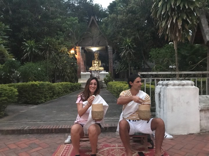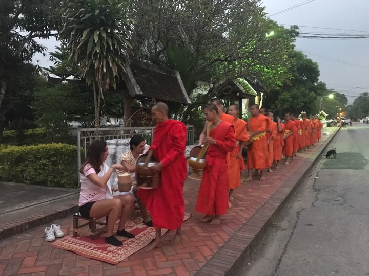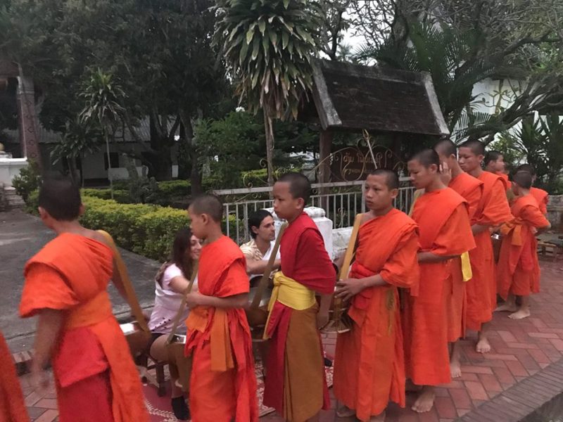 La sveglia suona alle 4:20 del mattino. Oggi ci aspetta la giornata forse più emozionante e spirituale di tutto il viaggio; ad attenderci fuori dall’hotel c’è sempre la nostra guida con un tuk tuk che ci accompagna sulla via principale della città dove sono presenti 7 templi e, dopo averci fatto indossare la tipica stola laotiana, averci consegnato un cesto in vimini pieno di riso già cotto, ci fa accomodare su degli sgabelli posizionati lungo il marciapiede davanti ad un tempio, e come da tradizione il tutto viene messo sopra un tappeto.