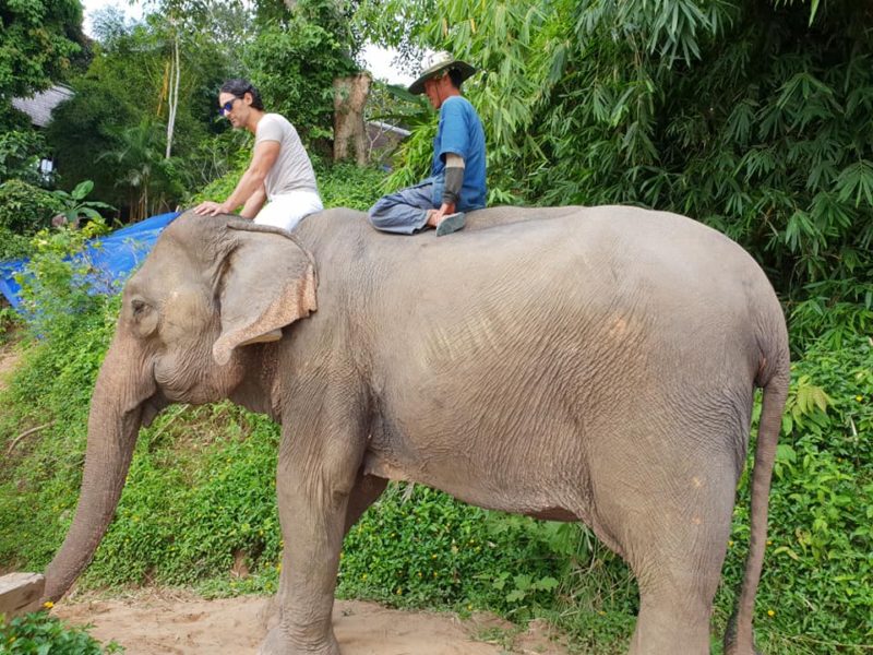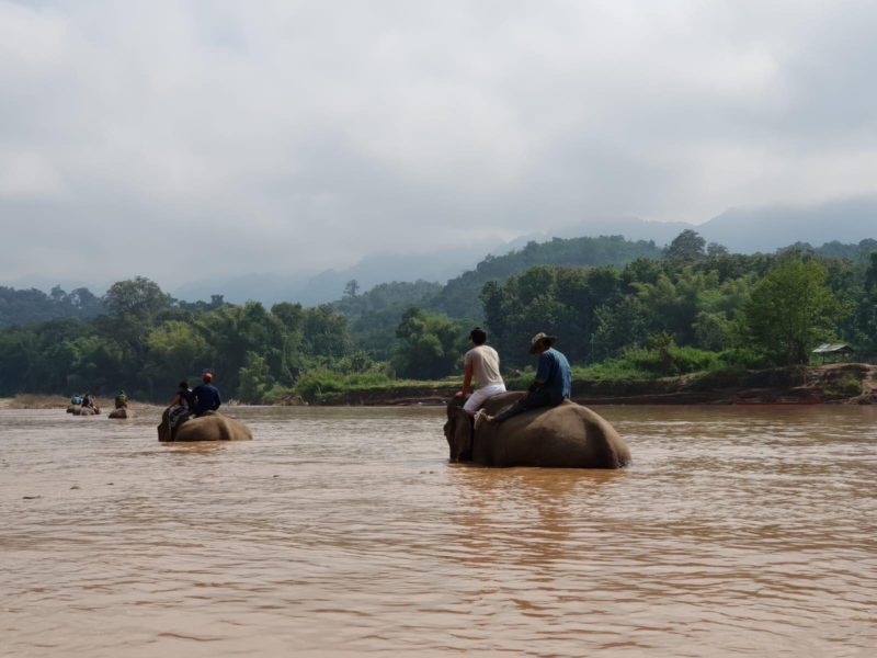 Poco dopo ci troviamo soli a godere il panorama dall’alto del dorso di un elefante percorrendo circa un km e attraversiamo il fiume dove gli elefanti vengono quasi sommersi dall’acqua e spuntiamo fuori solo noi. L’assenza della sella ha sicuramente reso l’esperienza più avventurosa per noi e più piacevole per lui e ci ha fatto sentire, anche solo per qualche ora, come dei veri Mahout (istruttore di elefanti).