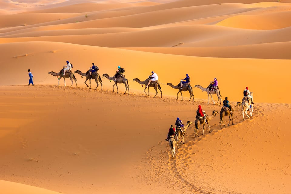 • Arriva infine a Merzouga, dove ti attende una notte sotto le stelle nel deserto. In cammello, attraversa le dune dorate del Sahara, per poi godere di una cena berbera intorno a un falò.