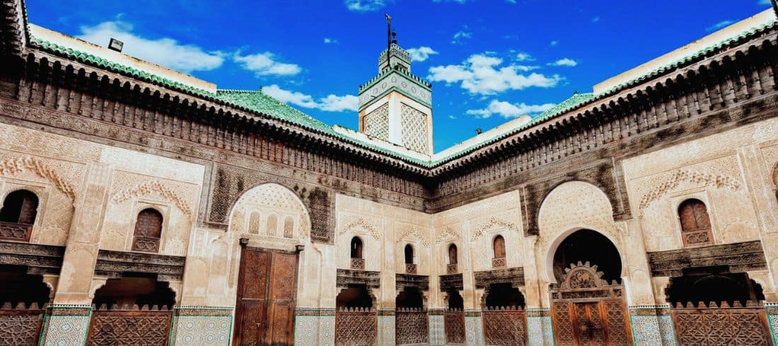 • Lasciato il deserto, dirigiti verso Fes, una delle città imperiali del Marocco. Immergiti subito nell’atmosfera medievale della medina di Fes, dichiarata Patrimonio dell’Umanità, visitando la madrasa Bou Inania, la famosa tanneria di Fes, dove possiamo vedere il processo tradizionale di lavorazione delle pelli, e la Moschea Karaouine, una delle università più antiche del mondo.