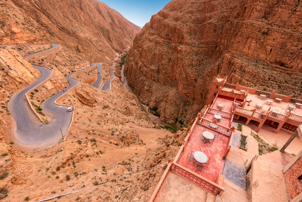 • Al mattino presto, parti per una vera avventura! Lascia Marrakech e dirigiti verso il deserto del Sahara. Fai una sosta a Ouarzazate, la “porta del deserto”, famosa per le sue kasbah e per essere stata set di numerosi film. Poi, prosegui per le gole di Todra, un paesaggio spettacolare di pareti di roccia alte e strette.